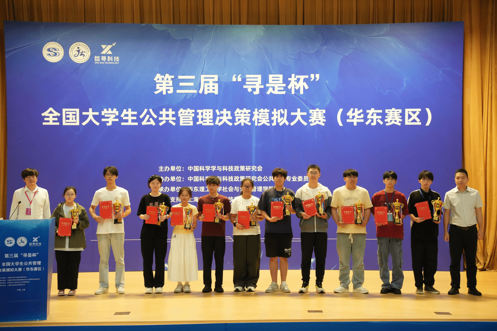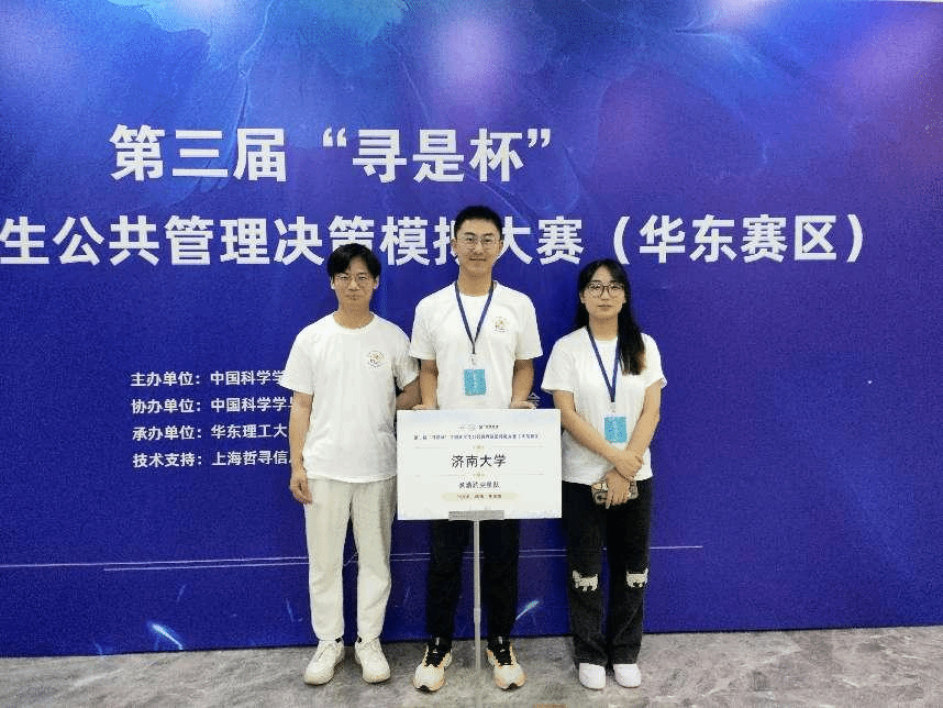 6月1日至6月2日,由中国科学学与科技政策研究会主办,中国科学学与科技政策研究会公共管理专业委员会协办,华东理工大学社会与公共管理学院承办的第三届“寻是杯”全国大学生公共管理决策模拟大赛(华东赛区)在华东理工大学(徐汇校区)隆重举行。由太阳官网刘钟华教师指导、行政管理专业2022级张文彪、李琦、曹晨晖等同学组成的“煮酒趵突泉”队,在与华东地区各高校的比拼中,荣获小组赛第5名、大赛二等奖的优异成绩。